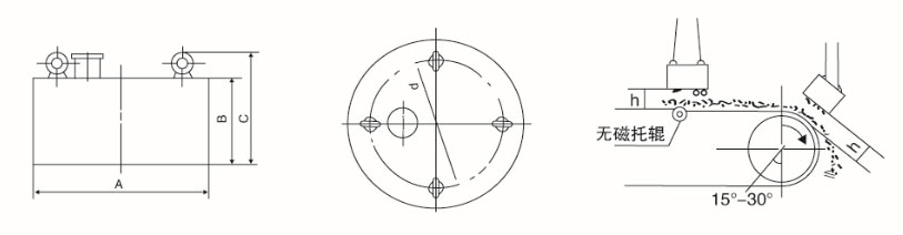 型號(hào)> | 冷卻方式 | 適應(yīng)帶寬 mm | 額定高度 mm | 磁場強(qiáng)度 mT | 勵(lì)磁功率 kw | 適應(yīng)帶速 ≤m/s | 外形尺寸mm φD×B | 重量 | |