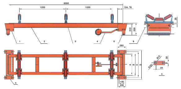 說(shuō)明:1、稱重架 2、稱重橋 3、原輸送機(jī)托輥改制的計(jì)量托輥 4、測(cè)速車及測(cè)速傳感器 5、輔助輥 6、輸送機(jī)框架